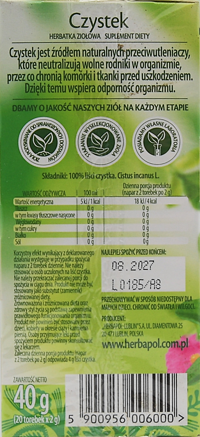 Cistus te er et naturligt kosttilskud baseret på cistrose-blade, kendt for deres høje indhold af antioxidanter. Disse kraftfulde stoffer neutraliserer frie radikaler i kroppen og hjælper med at beskytte celler og væv mod oxidativ skade, hvilket styrker kroppens naturlige immunforsvar. For optimal effekt anbefales det at drikke en infusion af to tebreve dagligt. Produktet leveres i praktiske individuelle portioner – 20 breve à 2 g, i alt 40 g. Vigtig information: Ikke egnet for personer med allergi over for cistrose-blade, børn, gravide eller ammende kvinder. Hvis du tager medicin, konsultér lægen før brug. En varieret kost og sund livsstil er essentiel for optimal sundhed.